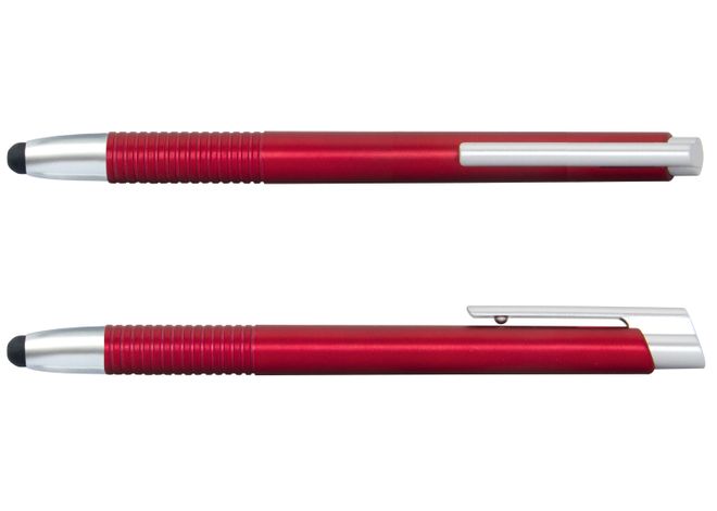Bolígrafo retráctil con acabado mate, clip y punta plateados, stylus en la punta para dispositivos de pantalla táctil.