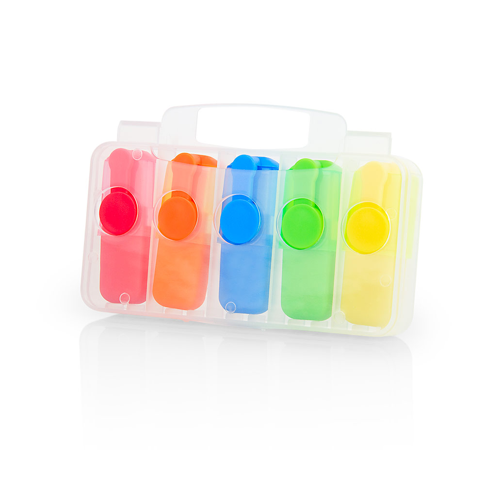 Set de 5 resaltadores en estuche traslúcido plástico.